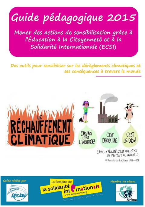 Guide pédagogique 2015: Mener des actions de sensibilisation grâce à l'Education à la Citoyenneté et à la Solidarité Internationale (ECSI): Des outils pour sensibiliser sur les dérèglements climatiques et ses conséquences à travers le monde Année de publication: 2015 Auteur institutionnel: RéCiDev Besançon (Réseau Citoyenneté Développement) Ce guide pédagogique est destiné aux acteurs de la semaine de solidarité internationale qui se déroule tous les ans autour de la 3ème semaine de novembre en France. Il propose des outils d'Education à la citoyenneté et à la solidarité internationale (ECSI) pour mener des actions de sensibilisation sur le dérèglement climatique et ses conséquences à travers le monde. Il comprend :- une première partie théorique sur les valeurs et la pédagogie de l'ECSI- une seconde partie pratique qui présente des outils pédagogiques- une troisième partie qui donne des informations pratiques sur les acteurs et les ressources en ECSI.