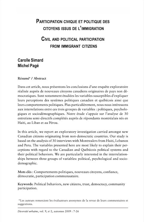 Participation civique et politique des citoyens issus de l’immigration (Diversité urbaine; vol. 9, no. 2) Année de publication: 2016 Auteur: Carolle Simard | Michel Pagé Auteur institutionnel: Groupe de recherche diversité urbaine (GRDU) | Centre d’études ethniques des universités montréalaises (CEETUM) Dans cet article, nous présentons les conclusions d’une enquête exploratoire réalisée auprès de nouveaux citoyens canadiens originaires de pays non dé- mocratiques. Sont notamment étudiées les variables susceptibles d’expliquer leurs perceptions des systèmes politiques canadien et québécois ainsi que leurs comportements politiques. Plus particulièrement, nous nous intéressons aux interrelations entre ces trois groupes de variables : politiques, psycholo- giques et sociodémographiques. Notre étude s’appuie sur l’analyse de 30 entretiens semi-directifs complétés auprès de répondants montréalais nés en Haïti, au Liban et au Pérou.