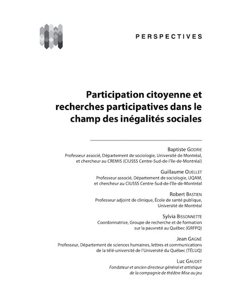 Participation citoyenne et recherches participatives dans le champ des inégalités sociales (Nouvelles pratiques sociales; vol. 30, no. 1) Année de publication: 2018 Auteur: Baptiste Godrie | Guillaume Ouellet | Robert Bastien | Sylvia Bissonnette | Jean Gagné | Luc Gaudet | Audrey Gonin | Isabelle Laurin | Chrisopher McAll | Geneviève McClure | François Régimbal | Jean-François René | Mireille Tremblay Auteur institutionnel: University of Quebec at Montreal Cet article analyse les effets de processus de participation citoyenne sur les inégalités sociales à partir de projets de recherche réalisés par les auteurs de l’article, membres d’une équipe multidisciplinaire composée de chercheurs et de partenaires issus de la communauté. La participation citoyenne peut avoir pour effet de lutter contre les inégalités sociales, en particulier d’accès à la parole des groupes les plus exclus, et de conduire les différents participants à se défaire d’un regard préétabli vis-à-vis des populations en situation de pauvreté. L’analyse met également l’accent sur les rapports de pouvoir au cœur des processus participatifs de recherche.