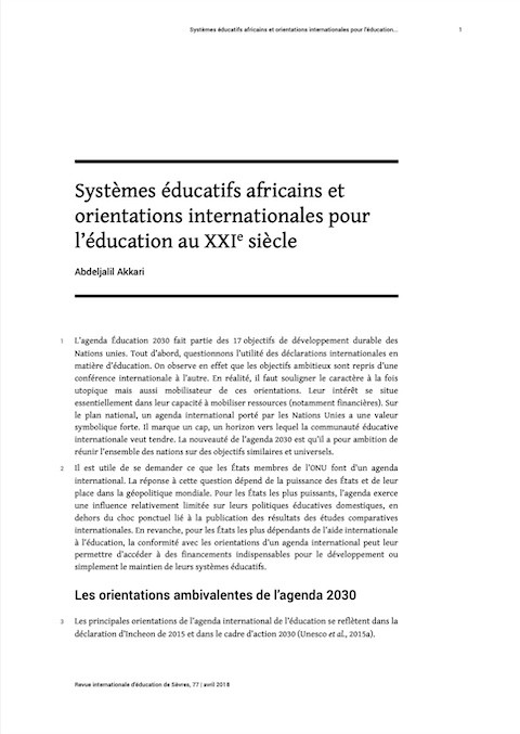 Systèmes éducatifs africains et orientations internationales pour l’éducation au XXIe siècle (Revue internationale d’éducation de Sèvres; no. 77) Année de publication: 2018 Auteur: Abdeljalil Akkari Auteur institutionnel: France Education international L’agenda Éducation 2030 fait partie des 17 objectifs de développement durable des Nations unies. Tout d’abord, questionnons l’utilité des déclarations internationales en matière d’éducation. On observe en effet que les objectifs ambitieux sont repris d’une conférence internationale à l’autre. En réalité, il faut souligner le caractère à la fois utopique mais aussi mobilisateur de ces orientations. Leur intérêt se situe essentiellement dans leur capacité à mobiliser ressources (notamment financières). Sur le plan national, un agenda international porté par les Nations Unies a une valeur symbolique forte. Il marque un cap, un horizon vers lequel la communauté éducative internationale veut tendre. La nouveauté de l’agenda 2030 est qu’il a pour ambition de réunir l’ensemble des nations sur des objectifs similaires et universels.2Il est utile de se demander ce que les États membres de l’ONU font d’un agenda international. La réponse à cette question dépend de la puissance des États et de leur place dans la géopolitique mondiale. Pour les États les plus puissants, l’agenda exerce une influence relativement limitée sur leurs politiques éducatives domestiques, en dehors du choc ponctuel lié à la publication des résultats des études comparatives internationales. En revanche, pour les États les plus dépendants de l’aide internationale à l’éducation, la conformité avec les orientations d’un agenda international peut leur permettre d’accéder à des financements indispensables pour le développement ou simplement le maintien de leurs systèmes éducatifs.