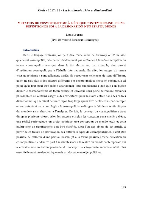 Mutation du cosmopolitisme à l’époque contemporaine : d’une définition de soi à la désignation d’un état du monde (Klesis Revue Philosophique; no. 38) Année de publication: 2017 Auteur: Louis Lourme Auteur institutionnel: Université Paul-Valéry Dans le langage ordinaire, on peut dire d’une rame de tramway ou d’une ville qu’elle est cosmopolite, cela ne fait évidemment pas référence à la même acception du terme « cosmopolitisme » que dans le fait de parler, par exemple, d’un projet d’institution cosmopolitique à l’échelle internationale. En effet, les usages du terme « cosmopolitisme » sont tellement variés, ils recouvrent tellement de sens différents, qu’on ne sait plus si des auteurs différents ont encore quelque chose en commun, à tel point qu’il faut peut-être même abandonner tout simplement l’idée que l’on puisse définir le cosmopolitisme de façon précise et univoque sous peine de réduire certaines philosophies ou certains usages à des caricatures pour les faire entrer dans des cadres définitionnels qui seraient de toute façon trop larges pour être pertinents – par exemple en se contentant de la tautologie « le cosmopolitisme désigne le fait de se sentir citoyen du monde » sans chercher à l’analyser. De fait, le concept de cosmopolitisme peut désigner plusieurs choses selon les auteurs et selon les contextes (une manière d’être, une réalité sociologique, un projet politique, une conception du monde, etc.), et cette multiplicité de significations doit être clarifiée. C’est l’un des objets de cet article. À partir de ce travail de clarification des différents types de cosmopolitismes, il doit être possible de réfléchir d’une part au besoin (et à la forme possible) d’une éducation au cosmopolitisme, et d’autre part à ses limites face à la réalité du monde contemporain qui a entrainé une mutation profonde du concept : la citoyenneté mondiale n’est plus essentiellement un objet éthique mais est devenue un objet politique.