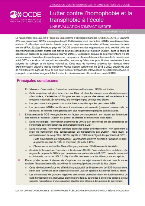 Lutter contre l’homophobie et la transphobie à l’école Année de publication: 2023 Auteur institutionnel: Organisation de coopération et de développement économiques (OCDE) Cette note de synthèse présente les résultats d’une expérimentation inédite que l’OCDE a menée en France (région parisienne), de 2018 à 2022, auprès de plus de 10 000 élèves âgés de 13 à 18 ans pour mesurer l’impact des interventions de SOS homophobie, la principale association française luttant contre les discriminations et les violences anti-LGBTI+. This briefing note presents the results of an unprecedented experiment that the OECD conducted in France (Paris region), from 2018 to 2022, with more than 10,000 pupils aged 13 to 18, to measure the impact of interventions by SOS homophobie, the leading French association fighting anti-LGBTI+ discrimination and violence.