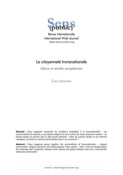 La citoyenneté transnationale: Idéaux et réalités européennes Année de publication: 2013 Auteur: Claus Leggewie Auteur institutionnel: Sens public Claus Leggewie rassemble les conditions préalables à la transnationalité – lescommunautés de migrants, le pluralisme religieux et de la culture de masse populaire hybride – enfaisant passer au premier plan le défi qu'elle présente: entre les cultures locales et les marchésmondiaux, comment un demos transfrontalier peut-il se construire?