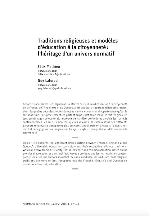 Traditions religieuses et modèles d’éducation à la citoyenneté : l’héritage d’un univers normatif (Politique et Sociétés; vol. 34, no. 2) Année de publication: 2015 Auteur: Félix Mathieu | Guy Laforest Auteur institutionnel: Société québécoise de science politique Cet article analyse les liens significatifs entre les curriculums d’éducation à la citoyenneté de la France, de l’Angleterre et du Québec, ainsi que leurs traditions religieuses respec-tives, lesquelles découlent toutes du noyau central et commun d’appartenance qu’est le christianisme. Plus précisément, en partant du postulat selon lequel le fait religieux, en tant qu’héritage socioculturel, imprègne de manière profonde et durable les sociétés contemporaines, les auteurs montrent que les valeurs et les idéaux issus des différents parcours religieux se transposent plus ou moins singulièrement à travers l’univers nor-matif et pédagogique des programmes français, anglais, puis québécois d’éducation à la citoyenneté.