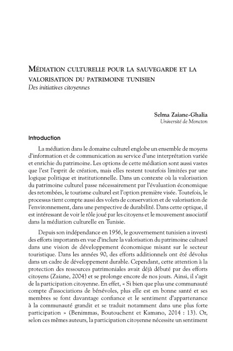 Médiation culturelle pour la sauvegarde et la valorisation du patrimoine tunisien: Des initiatives citoyennes (Ethnologies; vol. 38, no. 1-2) Année de publication: 2016 Auteur: Selma Zaiane-Ghalia Auteur institutionnel: Association canadienne d’ethnologie et de folklore | Laval University Depuis son indépendance, la Tunisie a consacré des efforts importants à la valorisation du patrimoine culturel dans un objectif de développement économique misant sur le secteur touristique. Les diverses institutions gouvernementales concernées par la sauvegarde et la valorisation des richesses patrimoniales, telles que le ministère de la Culture et le ministère du Tourisme, ont mis en place plusieurs actions de médiation culturelle à cet effet. De nombreux rapports et publications mentionnent ces données mais l’on a peu écrit sur l’apport important des citoyens et des organisations communautaires à ce domaine de la médiation culturelle. Or le mouvement associatif a toujours été fort en Tunisie et il s’est renforcé depuis la révolution de 2010. À partir de visites et de rencontres personnelles effectuées sur le terrain et complétées par des données récentes colligées sur Internet – sur des blogues, des pages sociales ou des sites plus professionnels –, nous nous proposons d’examiner la place de la participation citoyenne dans la médiation culturelle en Tunisie. Nous prendrons à cet effet des exemples de projets concrets.