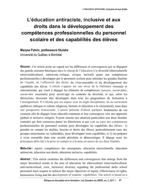 L’éducation antiraciste, inclusive et aux droits dans le développement des compétences professionnelles du personnel scolaire et des capabilités des élèves (Éthique en éducation et en formation; no. 3) Année de publication: 2017 Auteur: Maryse Potvin Auteur institutionnel: Université du Québec à Montréal (UQAM) Cet article porte un regard sur les différences et convergences qui se dégagent des grands courants théoriques dans le champ de l’éducation à la diversité ethnoculturelle (inter/multiculturel, antiraciste /critique, civique, inclusif) quant aux compétences professionnelles à développer par le personnel scolaire pour atteindre les grandes finalités de l’équité, de l’effectivité des droits, du vivre-ensemble et du développement des capabilités des élèves. L’article s’appuie sur une revue de la littérature nationale et internationale, qui visait à dégager les éléments de compétences (savoirs, savoir-faire, savoir-être essentiels) pour savoir-agir en contexte de diversité, et qui, selon les théoriciens, devraient être développés dans tous les programmes de formation à l’enseignement. Il n’aborde pas ces enjeux sous un angle disciplinaire, lié au curriculum québécois (éthique et culture religieuse, histoire et éducation à la citoyenneté), mais dans une perspective transversale. L’article présente d’abord quelques fondements de ces courants afin de dégager leurs objectifs communs et leur convergence vers une approche globale et inclusive intégrée. Il porte ensuite une attention particulière aux deux finalités centrales qui font consensus parmi les théoriciens et qui sont au coeur des compétences professionnelles du personnel scolaire pour développer les capabilités des élèves : 1) prendre en compte les réalités, besoins et droits des élèves, particulièrement ceux des groupes minoritaires ou vulnérables, pour développer leurs capabilités, et 2) les préparer à vivre ensemble dans une société pluraliste et démocratique. Il dégage aussi les principaux défis liés à la prise en compte et à la mise en oeuvre de ces deux finalités.