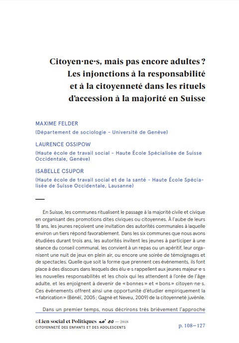 Citoyen·ne·s, mais pas encore adultes ? Les injonctions à la responsabilité et à la citoyenneté dans les rituels d’accession à la majorité en Suisse Année de publication: 2018 Auteur: Maxime Felder | Laurence Ossipow | Isabelle Csupor Auteur institutionnel: Lien social et Politiques En Suisse, les communes ritualisent le passage à la majorité civile et civique en organisant des promotions dites civiques ou citoyennes. À l’aube de leurs 18 ans, les jeunes reçoivent une invitation des autorités communales à laquelle environ un tiers répond favorablement. Dans les six communes que nous avons étudiées durant trois ans, les autorités invitent les jeunes à participer à une séance du conseil communal, les convient à un repas ou un apéritif, leur organisent une nuit de jeux en plein air, ou encore une soirée de témoignages et de spectacles. Quelle que soit la forme que prennent ces événements, ils font place à des discours dans lesquels des élu·e·s rappellent aux jeunes majeur·e·s les nouvelles responsabilités et les choix qui les attendent à l’orée de l’âge adulte, et les enjoignent à devenir de «bonnes» et «bons» citoyen·ne·s. Ces événements offrent ainsi une opportunité d’étudier empiriquement la «fabrication» (Bénéï, 2005; Gagné et Neveu, 2009) de la citoyenneté juvénile. Dans un premier temps, nous décrirons très brièvement l’approcheméthodologique et les dispositifs mis en place par les six communes étudiées. Puis, nous ferons une analyse des discours qui, outre l’appel au vote, incitent à se battre pour des droits qui permettent à la démocratie de perdurer, mais ne s’arrêtent pas à cette définition restreinte de la citoyenneté. Enfin, nous nous concentrerons sur trois tensions que révèle le croisement de ces injonctions à la citoyenneté, avec ce qu’en disent les jeunes participant·e·s.