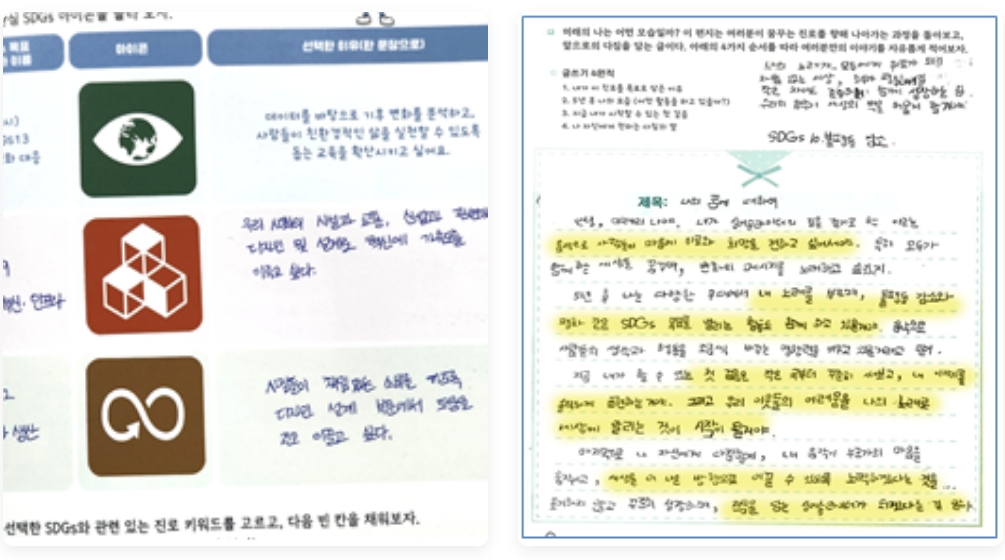 ์ด ๊ฐ์ด๋ฐ ํ์์ฉ ์ํฌ๋ถ์ โ๋-์ธ๊ณ-๋์ ๋ฏธ๋โ๋ก ์ด์ด์ง๋ ์ ์ฒด์ ๊ตฌ์กฐ ์์์ ํ์๋ค์ด ์์ ์ ์ง๋ก ์ ํ์ ํตํด ์ง๊ตฌ ๊ณต๋์ฒด์ ๋ฏธ์น ์ค๋ฆฌ์ ยทํ๊ฒฝ์ ์ํฅ์ ๋นํ์ ์ผ๋ก ์ฑ์ฐฐํ ๊ธฐํ๋ฅผ ์ ๊ณตํ๋ ๋ฐ ์ฃผ์์ ์ ๋๋ค. ์ํฌ๋ถ์ ๊ฒ์๊ณผ ๊ทธ๋ฃน๋ณ ํ๋์ ํฌํจํ์ฌ โณ์ธ์๊ณผ ๋, ์ฐ๊ฒฐ์ ์์ โณ๋๋ง์ ์ง์๊ฐ๋ฅ๋ฐ์ ๋ชฉํ(SDGs) ํฝ(PICK) โณSDGs ์ ์ธ์ ๋ฌธ์ ์ดํดํ๊ธฐ โณ์ธ์ ๋ฌธ์ ํํ๋จ โ์ธ์์ ์ค์ฒด๋ฅผ ๋ฐํ๋ผโ โณ์ธ์์ ๊ตฌํ ๊ฟํ โํด๊ฒฐ์ฑ ์ ์ ์ํ๋ผโ โณ๋์ ์ง๋ก, ์ธ์์ ๋ฐ๊พธ๋ ์ฒซ๊ฑธ์) ๋ฑ ์ด 6์ฐจ์๋ก ๊ตฌ์ฑ๋์ด์๋ค.