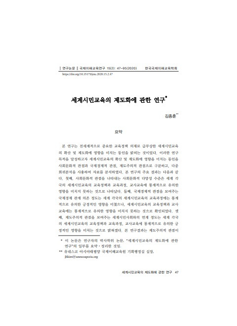 ์ธ๊ณ์๋ฏผ๊ต์ก์ ์ ๋ํ์ ๊ดํ ์ฐ๊ตฌ (๊ตญ์ ์ดํด๊ต์ก์ฐ๊ตฌ; Vol. 15, No. 2) ๋ฐํ ์ฐ๋: 2020 ์ ์: ๊น์ข