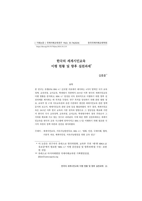 ํ๊ตญ์ ์ธ๊ณ์๋ฏผ๊ต์ก ์ดํ ํํฉ ๋ฐ ํฅํ ์ค์ฒ๊ณผ์ (๊ตญ์ ์ดํด๊ต์ก์ฐ๊ตฌ; Vol. 19, No. 2) ๋ฐํ ์ฐ๋: 2024 ์ ์: ๊น์ข