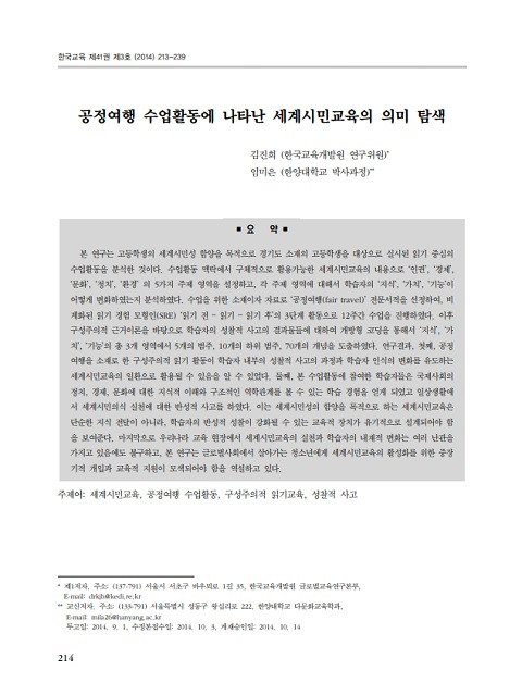 ํ๋์ ๋ํ๋ ์ธ๊ณ์๋ฏผ๊ต์ก์ ์๋ฏธ ํ์ (ํ๊ตญ๊ต์ก; Vol. 41, No. 3) ๋ฐํ ์ฐ๋: 2014 ์ ์: ๊น์งํฌ | ์๋ฏธ์ ๋จ์ฒด ์ ์: ํ๊ตญ๊ต์ก๊ฐ๋ฐ์ ๋ณธ ์ฐ๊ตฌ๋ ๊ณ ๋ฑํ์์ ์ธ๊ณ์๋ฏผ์ฑ ํจ์์ ๋ชฉ์ ์ผ๋ก ๊ฒฝ๊ธฐ๋ ์์ฌ์ ๊ณ ๋ฑํ์์ ๋์์ผ๋ก ์ค์๋ ์ฝ๊ธฐ ์ค์ฌ์ ์์