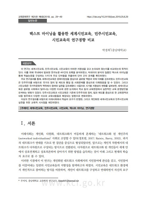 ผ๋ฌธ์ ๊ตฌ์ฑํ๋ 3,932๊ฐ ์ฃผ์ ๋จ์ด๋ค์ ์ถ์ถํ์ฌ ๋จ์ด ๊ฐ์ ๊ด๊ณ๋ฅผ ํ์ธํ์๋ค. ์ฃผ์ ์ฐ๊ตฌ๊ฒฐ๊ณผ๋ฅผ ํตํด, ์ธ๊ณ์๋ฏผ๊ต์ก์ ๋ฌธํ๋ค์์ฑ์ ์ค์ฌ์ผ๋ก ๊ธ๋ก๋ฒ ์ญ๋๊ณผ ๊ตญ์ ์ดํด๋ฅผ ๊ฐ์กฐํ์๊ณ , ๋ฏผ์ฃผ์๋ฏผ๊ต์ก์ ๋ฏผ์ฃผ์ฃผ์๋ฅผ ๋ฐํ์ผ๋ก ๊ตญ๊ฐ์ ์ ์น ๋ฐ ์ ๋์ ํต์ผ ๋ฑ ์ฌํ๋ฌธ์ ๋ฅผ ์ค์ฌ์ผ๋ก ๋ค๋ค์์์ ์ ์ ์์๋ค. ๊ทธ๋ฆฌ๊ณ ์๋ฏผ๊ต์ก์ ๊ตญ๊ฐ์ โค๋ฌธํ์ ๋งฅ๋ฝ์์ ์ฐธ์ฌ์ ์ค์ฒ์ ๊ฐ์กฐํด์๋ค. ๋ค์์ผ๋ก ์๊ธฐ๋ณ ์งํฅ์ฑ์ ๋ณํ๋ฅผ ์ดํด๋ณด๋ฉด, ์ธ๊ณ์๋ฏผ๊ต์ก์ ๊ธ๋ก๋ฒ ์ฌํ์์ ์ผ์ด๋๋ ๋ค์ํ ์ด์์ ๊ดํ ๋