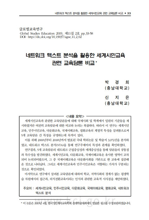 ผ์๋ ๋ณต์กํ๋ค. ๋ฐ๋ผ์ ์ด ์ฐ๊ตฌ๋ ์ธ๊ณ์๋ฏผ๊ต์ก, ๋ฏผ์ฃผ์๋ฏผ๊ต์ก, ๋ค๋ฌธํ๊ต์ก, ๊ตญ์ ์ดํด๊ต์ก, ํํ๊ต์ก์ ๊ณ์ด์ ํน์ฑ์ ์ดํด๋ด์ผ๋ก์จ 5๊ฐ ๊ต์ก๋ด๋ก ๊ฐ ํน์ง์ ๊ท๋ช
