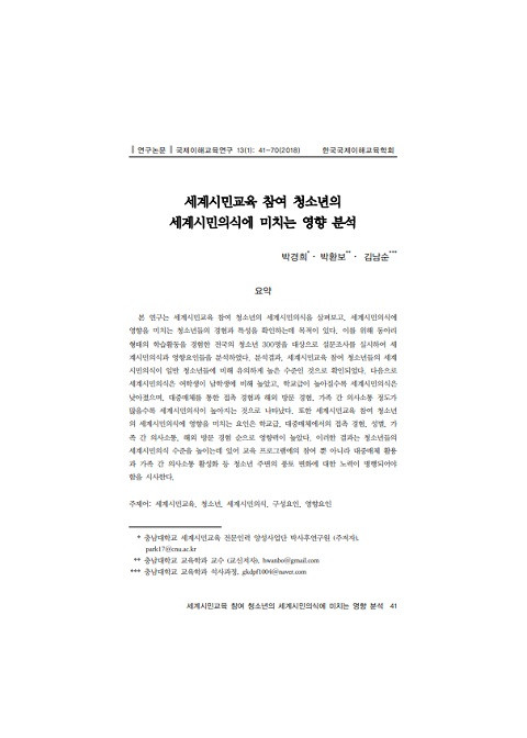 ๋ค์ ๋นํด ์ ์ํ๊ฒ ๋์ ์์ค์ธ ๊ฒ์ผ๋ก ํ์ธ๋์๋ค. ๋ค์์ผ๋ก ์ธ๊ณ์๋ฏผ์์์ ์ฌํ์์ด ๋จํ์์ ๋นํด ๋์๊ณ , ํ๊ต๊ธ์ด ๋์์ง์๋ก ์ธ๊ณ์๋ฏผ์์์ ๋ฎ์์ก์ผ๋ฉฐ, ๋์ค๋งค์ฒด๋ฅผ ํตํ ์ ์ด ๊ฒฝํ๊ณผ ํด์ธ ๋ฐฉ๋ฌธ ๊ฒฝํ, ๊ฐ์กฑ ๊ฐ ์์ฌ์ํต ์ ๋๊ฐ ๋ง์์๋ก ์ธ๊ณ์๋ฏผ์์์ด ๋์์ง๋ ๊ฒ์ผ๋ก ๋ํ๋ฌ๋ค. ๋ํ ์ธ๊ณ์๋ฏผ๊ต์ก ์ฐธ์ฌ ์ฒญ์๋
