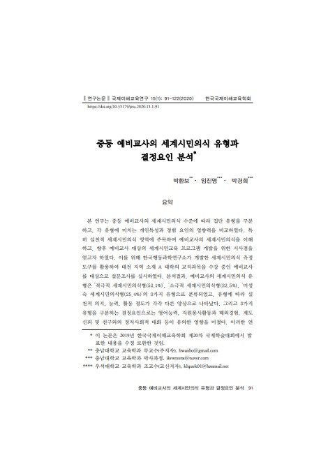 ์ค๋ฑ ์๋น๊ต์ฌ์ ์ธ๊ณ์๋ฏผ์์ ์ ํ๊ณผ ๊ฒฐ์ ์์ธ ๋ถ์ (๊ตญ์ ์ดํด๊ต์ก์ฐ๊ตฌ; Vol. 15, No. 1) ๋ฐํ ์ฐ๋: 2020 ์ ์: ๋ฐํ๋ณด | ์์ง์ | ๋ฐ๊ฒฝํฌ ๋จ์ฒด ์ ์: ํ๊ตญ๊ตญ์ ์ดํด๊ต์กํํ ๋ณธ ์ฐ๊ตฌ๋ ์ค๋ฑ ์๋น๊ต์ฌ์ ์ธ๊ณ์๋ฏผ์์ ์์ค์ ๋ฐ๋ผ ์ง๋จ ์ ํ์ ๊ตฌ๋ถํ๊ณ , ๊ฐ ์ ํ์ ๋ฏธ์น๋ ๊ฐ์ธํน์ฑ๊ณผ ๊ฒฝํ ์์ธ์ ์ํฅ๋ ฅ์ ๋น๊ตํ์๋ค. ํนํ ์ค์ฒ์ ์ธ๊ณ์๋ฏผ์์ ์์ญ์ ์ฃผ๋ชฉํ์ฌ ์๋น๊ต์ฌ์ ์ธ๊ณ์๋ฏผ์์์ ์ดํดํ๊ณ , ํฅํ ์๋น๊ต์ฌ ๋์์ ์ธ๊ณ์๋ฏผ๊ต์ก ํ๋ก๊ทธ๋จ ๊ฐ๋ฐ์ ์ํ ์์ฌ์ ์ ์ป๊ณ ์ ํ์๋ค. ์ด๋ฅผ ์ํด ํ๊ตญํ๋๊ณผํ์ฐ๊ตฌ์๊ฐ ๊ฐ๋ฐํ ์ธ๊ณ์๋ฏผ์์ ์ธก์ ๋๊ตฌ๋ฅผ ํ์ฉํ์ฌ ๋์ ์ง์ญ ์์ฌ A ๋ํ์ ๊ต์ง๊ณผ๋ชฉ์ ์๊ฐ ์ค์ธ ์๋น๊ต์ฌ๋ฅผ ๋์์ผ๋ก ์ค๋ฌธ์กฐ์ฌ๋ฅผ ์ค์ํ์๋ค. ๋ถ์๊ฒฐ๊ณผ, ์๋น๊ต์ฌ์ ์ธ๊ณ์๋ฏผ์์ ์ ํ์ โ์ ๊ทน์ ์ธ๊ณ์๋ฏผ์์ํ(52.1%)โ, โ์๊ทน์ ์ธ๊ณ์๋ฏผ์์ํ(22.5%), โ๋ฏธ์ฑ์ ์ธ๊ณ์๋ฏผ์์ํ(25.4%)โ์ 3๊ฐ์ง ์ ํ์ผ๋ก ๋ถ๋ฅ๋์๊ณ , ์ ํ์ ๋ฐ๋ผ ์ค์ฒ์ ์์ง, ๋ฅ๋ ฅ, ํ๋ ์ ๋๊ฐ ๊ฐ๊ฐ ๋ค๋ฅธ ์์์ผ๋ก ๋ํ๋ฌ๋ค. ๊ทธ๋ฆฌ๊ณ 3๊ฐ์ง ์ ํ์ ๊ตฌ๋ถํ๋ ๊ฒฐ์ ์์ธ์ผ๋ก๋ ์์ด๋ฅ๋ ฅ, ์์๋ด์ฌํ๋๊ณผ ํด์ธ๊ฒฝํ, ์ ๋์ ๋ขฐ ๋ฐ ์น๊ตฌ์์ ์ ์น์ฌํ์ ๋ํ ๋ฑ์ด ์ ์ํ ์ํฅ์ ๋ฏธ์ณค๋ค. ์ด๋ฌํ ์ฐ๊ตฌ๊ฒฐ๊ณผ๋ ์๋น๊ต์ฌ์ ์ธ๊ณ์๋ฏผ์์ ์ ํ๊ณผ ํน์ฑ์ ๊ณ ๋ คํ์ฌ ๊ต์ก๋ชฉํ๋ฅผ ์ค์ ํ ํ์๊ฐ ์์์ ์์ฌํ๋ค.