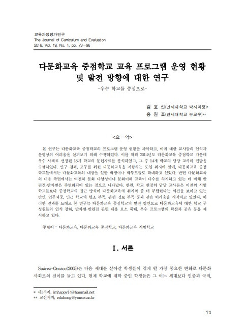 다문화교육 중점학교 교육 프로그램 운영 현황 및 발전 방향에 대한 연구 (교육과정평가연구; Vol. 19, No. 1) 발행 연도: 2016 저자: 김혜선 | 홍원표 단체 저자: Korea Institute for Curriculum and Evaluation (KICE) 본 연구는 다문화교육 중점학교의 프로그램 운영 현황을 파악하고, 이에 대한 교사들의 인식과 운영상의 어려움을 살펴보기 위해 수행되었다. 이를 위해 2014년도 다문화교육 중점학교 가운데 우수 사례로 선정된 18개 학교의 문헌자료를 분석하였고, 그 중 14개 학교의 담당 교사와 면담을 수행하였다. 연구 결과, 모두를 위한 다문화교육을 지향하는 도입 취지에 맞게, 다문화교육 중점학교들에서는 다문화교육의 대상을 일반 학생이나 학부모들로 확대하고 있었다. 반면 다문화교육의 내용 측면에서는 여전히 문화 다양성이나 문화이해 교육이 다수를 차지하고 있는 데 비해 반편견·반차별은 주변화되어 있는 것으로 나타났다. 한편, 학교 현장의 담당 교사들은 이전의 시범학교들보다 중점학교의 접근 방식이 다문화교육의 취지와 좀 더 부합한다는 의견을 보이고 있는 반면, 업무과중, 인근 학교의 협조 부족, 관련 정보 부족 등과 같은 어려움을 지적하고 있었다. 이러한 결과를 토대로 본 연구는 다문화교육 중점학교의 발전 방안으로 다문화교육에 대한 학교 구성원들의 인식 강화, 반차별·반편견 관련 내용 요소 확대, 우수 프로그램의 확산과 공유 등을 제시하고 있다.