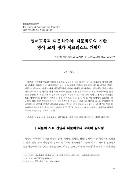 영어교육과 다문화주의: 다문화주의 기반 영어 교재 평가 체크리스트 개발 (교육과정평가연구; Vol. 20, No. 4) 발행 연도: 2017 저자: 김민아 | 어도선 단체 저자: 한국교육과정평가원 다문화 수용성이 중요한 사회적 담론으로 부상함에 따라 2015년 영어과 교육과정 개정에 다문화 이해가 성취기준으로 제시되었다. 영어 교재(교과서 포함)가 학습자의 다문화 이해에 영향을 미칠 수 있으므로 영어 교재가 다문화주의의 이념과 원리를 잘 반영하고 있는지를 살피는 일은 매우 중요하다. 본 연구는 영어 교재 평가와 관련한 기존 연구와 이미 소개된 체크리스트를 분석 하고 종합한 후 우리 사회의 영어교육 환경에 적합한 다문화주의 기반 영어 교재 평가 체크리스트를 체계적이고 상세하게 제시하는 것을 목적으로 하고 있다. 이 도구의 타당성과 효용성을 검증하기 위해 고교 영어교과서에 이 체크리스트를 적용하여 교과서의 다문화 요소를 분석하고 평 가하였으며, 다문화 반영이 미흡하게 나타난 것으로 평가 결과를 보여주었다. 이 연구를 통해 학 습자들이 언어적으로 뿐 아니라 ‘다문화적으로’ 성장할 수 있는 다문화 친화적인 영어교육 환경이 조속히 마련되기를 기대하고 있다.