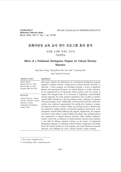 ๋ฌธํ๋ค์์ฑ ๊ต์ก ๊ต์ฌ ์ฐ์ ํ๋ก๊ทธ๋จ ํจ๊ณผ ๋ถ์ (๋ค๋ฌธํ๊ต์ก์ฐ๊ตฌ; Vol. 17, No. 1) ๋ฐํ ์ฐ๋: 2024 ์ ์: ์ฑ์ํ | ๋ชจ๊ฒฝํ | ๋ฐ์ธ๋ | ๊น๊ท์ ๋จ์ฒด ์ ์: ํ๊ตญ๋ค๋ฌธํ๊ต์กํํ ๋ณธ ์ฐ๊ตฌ์ ๋ชฉ์ ์ ๋ฌธํ๋ค์์ฑ ๊ต์ก ์ญ๋ ๊ฐํ๋ฅผ ์ํ ๊ต์ฌ ์ฐ์ ํ๋ก๊ทธ๋จ์ ํจ๊ณผ๋ฅผ ๋ถ์ํ๋ ๊ฒ์ด๋ค. ์ด๋ฅผ ์ํด ๋ฌธํ๋ค์์ฑ ๊ต์ฌ ๊ต์ก์ ๊ดํ ๊ตญ๋ด์ธ์ ์ฃผ์ ์ ํ ์ฐ๊ตฌ๋ฅผ ๊ฒํ ํ์ฌ 2๋ฐ 3์ผ 17์๊ฐ์ ์งํฉ ์ฐ์ ํ๋ก๊ทธ๋จ์ ๊ฐ๋ฐํ์์ผ๋ฉฐ, 2023๋