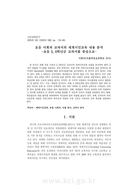 ์ด๋ฑ ์ฌํ๊ณผ ๊ต๊ณผ์์ ์ธ๊ณ์๋ฏผ๊ต์ก ๋ด์ฉ ๋ถ์: ์ด๋ฑ 5, 6ํ๋