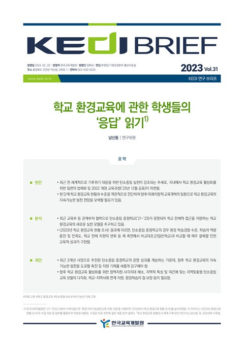 ํ๊ต ํ๊ฒฝ๊ต์ก์ ๊ดํ ํ์๋ค์ โ์๋ตโ ์ฝ๊ธฐ (KEDI Brief; vol. 31, 2023) ๋ฐํ ์ฐ๋: 2024 ์ ์: ๋จ์ ๋ ๋จ์ฒด ์ ์: ํ๊ตญ๊ต์ก๊ฐ๋ฐ์ ํ์โข ์ต๊ทผ ์ ์ธ๊ณ์ ์ผ๋ก ๊ธฐํ์๊ธฐ ๋์์ ์ํ ํ์์ค๋ฆฝ ์ค์ฒ์ด ๊ฐ์กฐ๋๋ ์ถ์ธ๋ก, ๊ตญ๋ด์์ ํ๊ต ํ๊ฒฝ๊ต์ก ํ์ฑํ๋ฅผ ์ํ ์ผ๋ จ์ ๋ฒ์ ํ ๋ฐ 2022 ๊ฐ์ ๊ต์ก๊ณผ์ (โ23๋