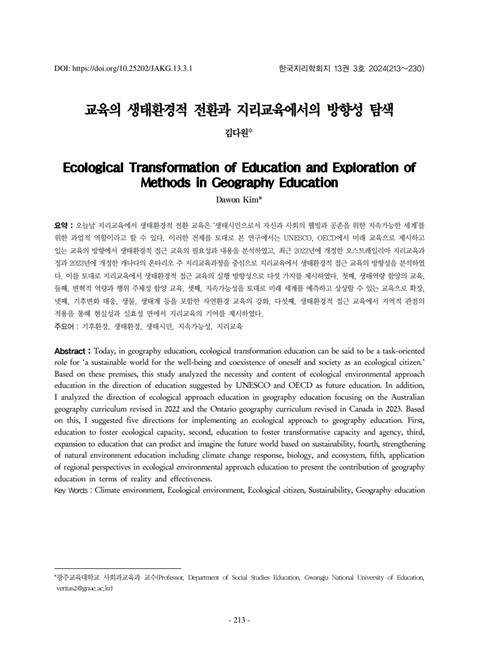 ๊ต์ก์ ์ํํ๊ฒฝ์ ์ ํ๊ณผ ์ง๋ฆฌ๊ต์ก์์์ ๋ฐฉํฅ์ฑ ํ์ (ํ๊ตญ์ง๋ฆฌํํ์ง; Vol. 13, No. 3) ๋ฐํ ์ฐ๋: 2024 ์ ์: ๊น๋ค์ ๋จ์ฒด ์ ์: ํ๊ตญ์ง๋ฆฌํํ ์ค๋๋ ์ง๋ฆฌ๊ต์ก์์ ์ํํ๊ฒฝ์ ์ ํ ๊ต์ก์ โ์ํ์๋ฏผ์ผ๋ก์ ์์ ๊ณผ ์ฌํ์ ์ฐ๋น๊ณผ ๊ณต์กด์ ์ํ ์ง์๊ฐ๋ฅํ ์ธ๊ณโ๋ฅผ ์ํ ๊ณผ์