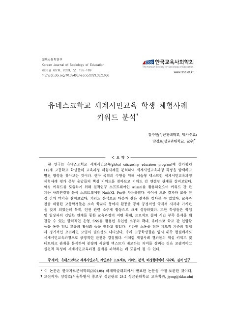 ์ ๋ค์ค์ฝํ๊ต ์ธ๊ณ์๋ฏผ๊ต์ก ํ์ ์ฒดํ์ฌ๋ก ํค์๋ ๋ถ์ (๊ต์ก์ฌํํ์ฐ๊ตฌ; Vol. 33, No. 2) ๋ฐํ ์ฐ๋: 2023 ์ ์: ๊น์์ฐ | ์์ ํธ ๋จ์ฒด ์ ์: ํ๊ตญ๊ต์ก์ฌํํํ ๋ณธ ์ฐ๊ตฌ๋ ์ ๋ค์ค์ฝํ๊ต ์ธ๊ณ์๋ฏผ๊ต์ก(global citizenship education program)์ ์ฐธ๊ฐํ๋ 112๊ฐ ๊ณ ๋ฑํ๊ต ํ์๋ค์ ๊ต์ก๊ณผ์ ์ฒดํ์ฌ๋ก๋ฅผ ๋ถ์ํ์ฌ ์ธ๊ณ์๋ฏผ๊ต์ก๊ณผ์ ํน์ฑ์ ํ์ํ๊ณ ๋ฐ์ ๋ฐฉํฅ์ ์ฐพ์๋ณด๋ ๊ฒ์ด๋ค. ์ฐ๊ตฌ ๋ชฉ์ ์ ์ํ์ ์ํด ์์ ํ ํ