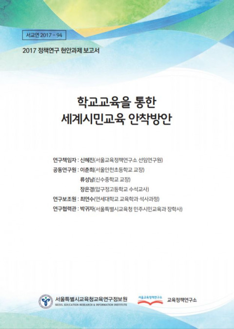 학교교육을 통한 세계시민교육 안착방안 발행 연도: 2017 저자: 신혜진 | 이춘희 | 류성남 | 장은경 단체 저자: 서울특별시교육청 교육연구정보원 | 서울교육정책연구소 이 연구는 세계시민교육이 학교교육을 통해 어떻게 운영되고 있는지 실태를 분석하여 세계시민교육이 학교교육에서 안착할 수 있는 방안을 모색해 보고자 하였다. 특히 세계시민교육이 학교에서 효과적으로 안착되기 위하여 교원의 역할이 중요하기에 교원을 대상으로 연구를 수행하였다. 최초로 서울시 전체 교원을 대상으로 연구하며 학교현장에서 세계시민교육이 단위학교 차원에서 어떻게 운영되고 있는지의 현황에 대한 이해를 높이고자 하였다. 이를 위하여 먼저 선행연구 및 주요정책문건 분석을 통한 세계시민교육의 주요 개념 및 정의를 고찰하였다. 다음으로 세계시민교육의 단위학교 적용 사례를 살펴보고 세계시민교육에 대한 교원인식, 교내 활용정도, 교원연수 등을 중심으로 세계시민교육의 학교활용현황을 분석하였다. 마지막으로 세계시민교육이 학교 내에서 안착할 수 있는 방안을 제안한다. 서울특별시교육청교육연구정보원이(가) 창작한 [정책-17-06] 학교교육을 통한 세계시민교육 안착방안 저작물은 "공공누리 제4유형(출처표시-상업적 이용금지-변경금지)" 조건에 따라 이용 할 수 있습니다.