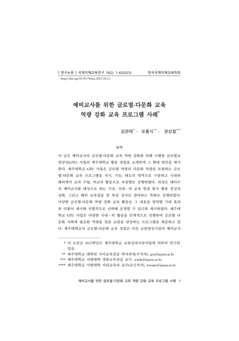 예비교사를 위한 글로벌-다문화 교육 역량 강화 교육 프로그램 사례 (국제이해교육연구; Vol. 18, No. 2) 발행 연도: 2023 저자: 김관태 | 오홍식 | 권상철 단체 저자: 한국국제이해교육학회 이 글은 예비교사의 글로벌-다문화 교육 역량 강화를 위해 시행한 글로벌교원양성(GTU) 사업의 제주대학교 활동 경험을 소개하며 그 확대 방안을 제시한다. 제주대학교 GTU 사업은 글로벌 역량과 다문화 역량을 포괄하는 글로벌-다문화 교육 프로그램을 지식, 기능, 태도의 영역으로 구분하고 국내와 해외에서 교과 수업, 비교과 활동으로 과정별로 진행하였다. 과정은 대다수의 예비교사를 대상으로 하는 기초, 국내․외 교육 현장 봉사 활동 중심의 심화, 그리고 해외 교육실습 및 특강 강사로 참여하는 특화로 진행하였다. 다양한 글로벌-다문화 역량 강화 교육 활동은 그 내용을 영역별 기대 효과와 더불어 제시해 선별적으로 선택해 운영할 수 있디록 제시하였다. 제주대학교 GTU 사업은 다양한 국내․외 활동을 단계적으로 진행하며 글로벌 다문화 사회에 필요한 역량을 갖춘 교원을 양성하는 프로그램을 제공하고 있다. 제주대학교의 글로벌-다문화 교육 경험은 다른 교원양성기관의 예비교사 양성 사업 활동에 참고할 수 있을 것이다.