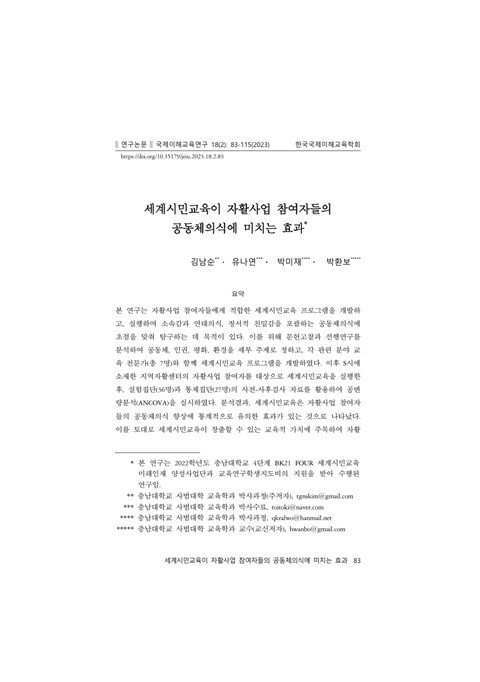 세계시민교육이 자활사업 참여자들의 공동체의식에 미치는 효과 (국제이해교육연구; Vol. 18, No. 2) 발행 연도: 2023 저자: 김남순 | 유나연 | 박미재 | 박환보 단체 저자: 한국국제이해교육학회 본 연구는 자활사업 참여자들에게 적합한 세계시민교육 프로그램을 개발하고, 실행하여 소속감과 연대의식, 정서적 친밀감을 포괄하는 공동체의식에 초점을 맞춰 탐구하는 데 목적이 있다. 이를 위해 문헌고찰과 선행연구를 분석하여 공동체, 인권, 평화, 환경을 세부 주제로 정하고, 각 관련 분야 교육 전문가(총 7명)와 함께 세계시민교육 프로그램을 개발하였다. 이후 S시에 소재한 지역자활센터의 자활사업 참여자를 대상으로 세계시민교육을 실행한 후, 실험집단(36명)과 통제집단(27명)의 사전-사후검사 자료를 활용하여 공변량분석(ANCOVA)을 실시하였다. 분석결과, 세계시민교육은 자활사업 참여자들의 공동체의식 향상에 통계적으로 유의한 효과가 있는 것으로 나타났다. 이를 토대로 세계시민교육이 창출할 수 있는 교육적 가치에 주목하여 자활사업이 추구하는 사회적 가치 실현에 적극적으로 활용할 필요가 있음을 제언하였다.