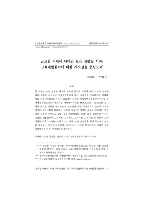 글로벌 의제에 나타난 교육 성평등 이슈: 교육개발협력에 대한 시사점을 중심으로 (국제이해교육연구; Vol. 17, No. 3) 발행 연도: 2022 저자: 조혜승 | 안해정 단체 저자: 한국국제이해교육학회 본 연구는 교육 성평등 제고를 위하여 글로벌 의제에 나타난 교육 성평등 관련 내용을 분석하여 교육개발협력에 대한 시사점을 도출하고자 하였다. 이를 위해 성평등과 관련된 대표적인 의제인 여성차별철폐협약(1979) 및 북경행동강령(1995)과 대표적인 개발협력의제인 MDGs(2000), SDGs(2015) 총 4개의 글로벌 의제를 분석하였다. 분석결과 첫째, 국제사회의 글로벌 의제는 여성의 교육기회의 확대에서 나아가 교육 내 성평등 제고를 강조하는 방향으로 쟁점이 전환되고 있는 것을 확인하였다. 둘째, 교육 성평등의 이슈가 다양화, 세분화되어 교육기회, 교육제도, 교육과정, 교육시설 등 다양한 교육 성평등 이슈가 의제로 포함되었다. 셋째, 교육 성평등을 위해 구조적인 변화를 추구하는 것으로 강조점이 전환되었다. 이러한 분석결과를 토대로 교육개발협력을 위한 시사점을 도출하였다.