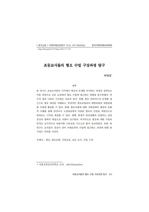 초등교사들의 혐오 수업 구상과정 탐구 (국제이해교육연구; Vol. 17, No. 1) 발행 연도: 2022 저자: 박애경 단체 저자: 한국국제이해교육학회 본 연구는 초등교사들의 시각에서 혐오의 문제를 인식하는 과정을 살펴보고 이를 바탕으로 초등 교실에서 혐오 수업에 접근하는 방법을 탐구하였다. 연구의 결과 나타난 시사점은 다음과 같다. 첫째, 혐오 피라미드의 단계별 접근으로 혐오 개념을 이해하고, 부정적인 혐오표현보다 대항표현과 대항문화를 수업에 활용할 수 있다. 둘째, 혐오사례에 대한 사회경제적 배경과 문화적 이해를 통해 편견이나 고정관념에서 비롯된 혐오의 감정을 객관적으로 바라보는 시각을 제공할 수 있다. 셋째, 학생의 일상생활과 연결되는 실천 중심의 변혁적 학습으로 지향이 요구된다. 마지막으로 혐오에 대한 수업의 목적은 궁극적으로 바람직한 시민성을 기르고자 함이 강조되었다. 또한, 본 연구는 교사들이 중심이 되어 아래로부터 수업에 접근하는 과정에 대한 탐구라는 의의를 가진다.