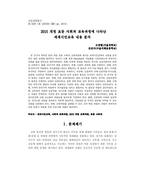 ๋ถ์์ ์ํํ์๋ค. ๋ถ์ ๊ฒฐ๊ณผ, 2009 ๊ฐ์ ๋๋น 2015 ๊ฐ์ ์ ์คํ๊ตโ์ฌํโ์์ ์ธ๊ณ์๋ฏผ๊ต์ก ๋ด์ฉ์์์ ๋น์ค์ด ์ฆ๊ฐํ๊ฑฐ๋ ๊ฐํ๋๋ ๋ชจ์ต์ ๋ฐ๊ฒฌํ ์์์๋ค. ๊ฐํ ๊ด๋ จ์ฑ์ ์ค์ฌ์ผ๋ก ์์ญ๋ณ๋ก ์ดํด๋ณด๋ฉด, ์ธ์ง ์์ญ๊ณผ ์ฌํโ