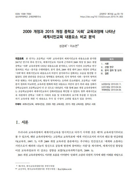 ์ฐ๊ตฌ์ ํ์ ์ฐ๊ตฌ๋ก, ์ธ๊ณ์๋ฏผ๊ต์ก ์งํ์ ๊ทผ๊ฑฐํ์ฌ 2009 ๊ฐ์ ๋ฐ 2015 ๊ฐ์ ์คํ๊ต โ์ฌํโ ๊ต์ก๊ณผ์ ์ ๋ํ๋ ๋ด์ฉ์์๋ฅผ ๋ถ์ํ๊ณ , ๋์๊ฐ ์ด์ ์ ์ด๋ฑํ๊ต ์ฐ๊ตฌ๊ฒฐ๊ณผ์๋ ๋น๊ตโ