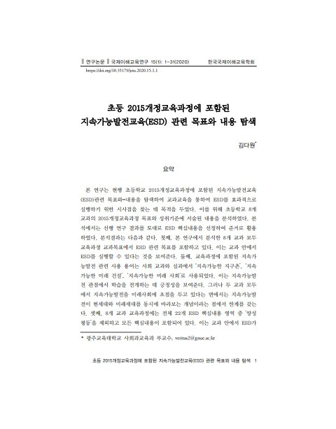 ์ด๋ฑ 2015๊ฐ์ ๊ต์ก๊ณผ์ ์ ํฌํจ๋ ์ง์๊ฐ๋ฅ๋ฐ์ ๊ต์ก(ESD) ๊ด๋ จ ๋ชฉํ์ ๋ด์ฉ ํ์ (๊ตญ์ ์ดํด๊ต์ก์ฐ๊ตฌ; Vol. 15, No. 1) ๋ฐํ ์ฐ๋: 2020 ์ ์: Dawon Kim ๋จ์ฒด ์ ์: Korean Society of Education for International Understanding ๋ณธ ์ฐ๊ตฌ๋ ํํ ์ด๋ฑํ๊ต 2015๊ฐ์ ๊ต์ก๊ณผ์ ์ ํฌํจ๋ ์ง์๊ฐ๋ฅ๋ฐ์ ๊ต์ก(ESD)๊ด๋ จ ๋ชฉํ์ ๋ด์ฉ์ ํ์ํ์ฌ ๊ต๊ณผ๊ต์ก์ ํตํ์ฌ ESD๋ฅผ ํจ๊ณผ์ ์ผ๋ก ์คํํ๊ธฐ ์ํ ์์ฌ์ ์ ์ฐพ๋ ๋ฐ ๋ชฉ์ ์ ๋์๋ค. ์ด๋ฅผ ์ํด ์ด๋ฑํ๊ต 8๊ฐ ๊ต๊ณผ์ 2015๊ฐ์ ๊ต์ก๊ณผ์ ๋ชฉํ์ ์ฑ์ทจ๊ธฐ์ค์ ์์ ๋ ๋ด์ฉ์ ๋ถ์ํ์๋ค. ๋ถ์์์๋ ์ ํ ์ฐ๊ตฌ ๊ฒฐ๊ณผ๋ฅผ ํ ๋๋ก ESD ํต์ฌ๋ด์ฉ์ ์ ์ ํ์ฌ ์ค๊ฑฐ๋ก ํ์ฉํ์๋ค. ๋ถ์๊ฒฐ๊ณผ๋ ๋ค์๊ณผ ๊ฐ๋ค. ์ฒซ์งธ, ๋ณธ ์ฐ๊ตฌ์์ ๋ถ์ํ 8๊ฐ ๊ต๊ณผ ๋ชจ๋ ๊ต์ก๊ณผ์ ๊ต๊ณผ๋ชฉํ์์ ESD ๊ด๋ จ ๋ชฉํ๋ฅผ ํฌํจํ๊ณ ์๋ค. ์ด๋ ๊ต๊ณผ ์์์ ESD๋ฅผ ์คํํ ์ ์๋ค๋ ๊ฒ์ ๋ณด์ฌ์ค๋ค. ๋์งธ, ๊ต์ก๊ณผ์ ์ ํฌํจ๋ ์ง์๊ฐ๋ฅ๋ฐ์ ๊ด๋ จ ์ฌ์ฉ ์ฉ์ด๋ ์ฌํ ๊ต๊ณผ์ ์ค๊ณผ์์ โ์ง์๊ฐ๋ฅํ ์ง๊ตฌ์ดโ, โ์ง์๊ฐ๋ฅํ ๋ฏธ๋ ๊ฑด์คโ, โ์ง์๊ฐ๋ฅํ ๋ฏธ๋ ์ฌํโ๋ก ์ฌ์ฉ๋์๋ค. ์ด๋ ์ง์๊ฐ๋ฅ๋ฐ์ ๊ด์ ์์ ํ์ต์ ์ ๊ฐํ๋ ๋ฐ ๊ธ์ ์ฑ์ ๋ณด์ฌ์ค๋ค. ๊ทธ๋ฌ๋ ๋ ๊ต๊ณผ ๋ชจ๋์์ ์ง์๊ฐ๋ฅ๋ฐ์ ์ ๋ฏธ๋์ฌํ์ ์ด์ ์ ๋๊ณ ์๋ค๋ ๋ฉด์์๋ ์ง์๊ฐ๋ฅ๋ฐ์ ์ด ํ์ธ๋์ ๋ฏธ๋์ธ๋๋ฅผ ๋์์ ๋ฐ๋ผ๋ณด๋ ๊ฐ๋