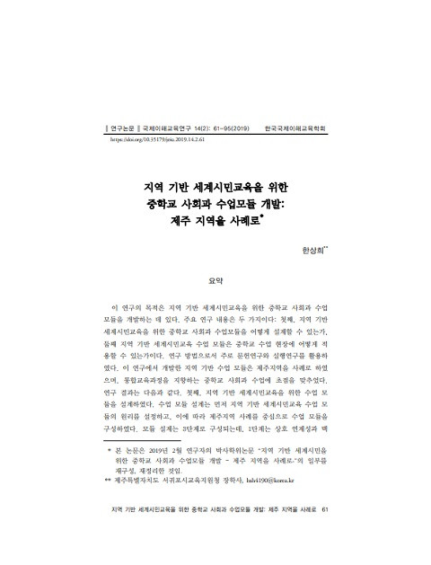 ๋ชจ๋์ ๊ฐ๋ฐํ๋ ๋ฐ ์๋ค. ์ฃผ์ ์ฐ๊ตฌ ๋ด์ฉ์ ๋ ๊ฐ์ง์ด๋ค: ์ฒซ์งธ, ์ง์ญ ๊ธฐ๋ฐ ์ธ๊ณ์๋ฏผ๊ต์ก์ ์ํ ์คํ๊ต ์ฌํ๊ณผ ์์