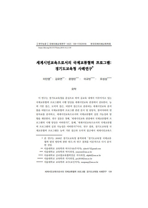 ์ธ๊ณ์๋ฏผ๊ต์ก์ผ๋ก์์ ๊ตญ์ ๊ต๋ฅํ๋ ฅ ํ๋ก๊ทธ๋จ: ๊ฒฝ๊ธฐ๋๊ต์ก์ฒญ ์ฌ๋ก์ฐ๊ตฌ (๊ตญ์ ์ดํด๊ต์ก์ฐ๊ตฌ; Vol. 14, No. 2) ๋ฐํ ์ฐ๋: 2019 ์ ์: ์ด์ธ์ | ๊น์ ์ฐ | ๋ฌธ์ ๋ฏผ | ์ด๊ท๋น | ์ ์ฑ์ ๋จ์ฒด ์ ์: Korean Society of Education for International Understanding (KOSEIU) ์ด ์ฐ๊ตฌ๋ ๊ฒฝ๊ธฐ๋๊ต์ก์ฒญ์ ์ค์ฌ์ผ๋ก ํ์ฌ ๊ณต๊ต์ก ๋ด์์ ์ด๋ฃจ์ด์ง๊ณ ์๋ ๊ตญ์ ๊ต๋ฅํ๋ ฅ ํ๋ก๊ทธ๋จ์ ์ํ ์์์ ์ธ๊ณ์๋ฏผ๊ต์ก ๊ด์ ์์ ๊ฒํ ํ๋ค. ๋ฅ๋ ฅ ๊ธฐ๋ฐ ์ ๊ทผ, ๋๋์ ์ ๊ทผ, ๋นํ์ ์ ๊ทผ์ผ๋ก ๋ถ๋ฅ๋๋ ์ธ๊ณ์๋ฏผ๊ต์ก ๋ถ์ํ์ ๋ฐํ์ผ๋ก ๊ตญ์ ๊ต๋ฅํ๋ ฅ ํ๋ก๊ทธ๋จ ๊ด๋ จ ๋ฌธ์ ๋ฐ ๋ด๋น์, ์ฐธ์ฌ์์์ ๋ฉด๋ด์๋ฃ๋ฅผ ๋ถ์ํ๊ณ , ์ธ๊ณ์๋ฏผ๊ต์ก์ผ๋ก์์ ๊ตญ์ ๊ต๋ฅํ๋ ฅ ์ค์ฒ ๊ฐ๋ฅ์ฑ๊ณผ ๋ฐฉํฅ์ ์ ์ํ๋ค. ์ฐ๊ตฌ ์ง๋ฌธ์ ์ฒซ์งธ, โ์ธ๊ณ์๋ฏผ๊ต์ก ๊ด์ ์์ ๊ตญ์ ๊ต๋ฅํ๋ ฅ ํ๋ก๊ทธ๋จ์ ์ํ ์์์ ์ด๋ ํ๊ฐ?โ, ๋์งธ, โ์ธ๊ณ์๋ฏผ๊ต์ก์ผ๋ก์์ ๊ตญ์ ๊ต๋ฅํ๋ ฅ ํ๋ก๊ทธ๋จ์ ์ค์ฒ ๊ฐ๋ฅ์ฑ์ ์ด๋ ํ๊ฐ?โ์ด๋ค. ์ฐ๊ตฌ ๊ฒฐ๊ณผ, ๊ฒฝ๊ธฐ๋๊ต์ก์ฒญ ๊ตญ์ ๊ต๋ฅํ๋ ฅ ํ๋ก๊ทธ๋จ์ ๋ฅ๋ ฅ ๊ธฐ๋ฐ ์ ๊ทผ๊ณผ ๋๋์ ์ ๊ทผ์์ ์ธ๊ณ์๋ฏผ๊ต์ก์ผ๋ก์์ ์ค์ฒ ๊ฐ๋ฅ์ฑ์ ๋ณด์๋ค. ๊ทธ๋ฌ๋ ํฅํ ์ธ๊ณ์๋ฏผ๊ต์ก์ ์ค์ฒ์ผ๋ก์ ๊ตญ์ ๊ต๋ฅํ๋ ฅ์ ํ์ฑํํ๊ธฐ ์ํด์๋ ๋ค์๊ณผ ๊ฐ์ ๊ฐ์ ๋ฐฉ์์ ์ ์ํ๋ค. ์ฒซ์งธ, ๋นํ์ ์ ๊ทผ์์์ ์ธ๊ณ์๋ฏผ๊ต์ก์ ๊ธฐ๋ฐํ ๊ตญ์ ๊ต๋ฅํ๋ ฅ์ ๊ฐํํด์ผ ํ๋ค. ๋์งธ, ๊ตญ์ ๊ต๋ฅํ๋ ฅ์ ๊ฐ์ ์ ๊ฒฝ์ ์ ๋ฐฐ๊ฒฝ๊ณผ ๊ด์ฌ์ ์๊ด์์ด ๋ชจ๋ ํ์์ด ์ฐธ์ฌํ ์ ์๋๋ก ์ด์๋์ด์ผ ํ๋ค. ์