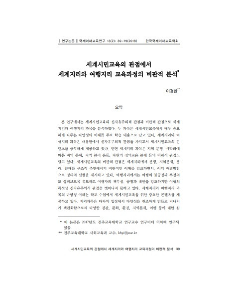 ์ธ๊ณ์๋ฏผ๊ต์ก์ ๊ด์ ์์ ์ธ๊ณ์ง๋ฆฌ์ ์ฌํ์ง๋ฆฌ ๊ต์ก๊ณผ์ ์ ๋นํ์ ๋ถ์ (๊ตญ์ ์ดํด๊ต์ก์ฐ๊ตฌ; Vol. 13, No. 2) ๋ฐํ ์ฐ๋: 2018 ์ ์: ์ด๊ฒฝํ ๋จ์ฒด ์ ์: ํ๊ตญ๊ตญ์ ์ดํด๊ต์กํํ ๋ณธ ์ฐ๊ตฌ์์๋ ์ธ๊ณ์๋ฏผ๊ต์ก์ ์ ์์ ์ฃผ์์ ๊ด์ ๊ณผ ๋นํ์ ๊ด์ ์ผ๋ก ์ธ๊ณ์ง๋ฆฌ์ ์ฌํ์ง๋ฆฌ ๊ณผ๋ชฉ์ ๋ถ์ํ์๋ค. ๋ ๊ณผ๋ชฉ์ ์ธ๊ณ์๋ฏผ๊ต์ก์์ ๋งค์ฐ ์ค์ํ๊ฒ ๋ค๋ฃจ๋ ๋ค์์ฑ์ ์ดํด๋ฅผ ์ฃผ์ ํ์ต ๋ด์ฉ์ผ๋ก ๋ด๊ณ ์๋ค. ์ธ๊ณ์ง๋ฆฌ์ ์ฌํ์ง๋ฆฌ ๊ณผ๋ชฉ์ ๋ด์ฉ๋ฉด์์ ์ ์์ ์ฃผ์์ ๊ด์ ์ ๊ฐ์ง๊ณ ์ ์ธ๊ณ์๋ฏผ๊ต์ก์ ์ฝํ