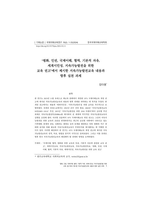 ‘평화, 인권, 국제이해, 협력, 기본적 자유, 세계시민성, 지속가능발전을 위한 교육 권고’에서 제시한 지속가능발전교육 내용과 향후 실천 과제 (국제이해교육연구; Vol. 19, No. 2) 발행 연도: 2024 저자: 김다원 단체 저자: 한국국제이해교육학회 본 연구는 2023년 11월 유네스코 제42차 총회에서 개정된 1974 국제이해교육 개정 권고에 제시된 지속가능발전교육의 내용과 향후 과제를 파악하는 데 목적을 두었다. 본 개정 권고에서는 새롭게 ‘세계시민성’, ‘지속가능발전’을 위한 교육을 적극적으로 포함하였다. 유엔과 유네스코에서는 1992년 리우 선언 발표, 2004년 ‘지속가능발전교육 10년(2005~2014)’ 추진, 2015년 ‘지속가능발전을 위한 2030 어젠더’에서 글로벌 추진 과제로 지속가능발전목표(SDGs)를 제시하여 전 세계에 적극적인 지속가능발전교육의 실행을 요청해 왔다. 이러한 흐름에서 1974 국제이해교육 개정 권고는 그간의 지속가능발전을 위한 교육의 흐름을 반영하면서도 최근의 글로벌 사회에서 나타나고 있는 기후변화, 분쟁과 갈등, 심화되는 불평등 등의 문제를 해결하고 인류 평화와 지구 생태계 유지를 위해 필요한 지속가능발전교육이 무엇인지를 제시했다는 데 각별한 의미가 있다. 이러한 배경에서 본 연구는 1974 국제이해교육 개정 권고에 제시된 지속가능발전교육의 성격, 목표, 방법을 분석적 시각으로 살펴보았다. 그리고 이를 토대로 향후 한국 지속가능발전교육의 해결해야 할 과제와 방향을 모색하였다.
