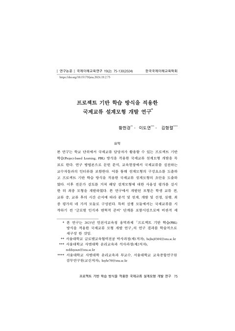 프로젝트 기반 학습 방식을 적용한 국제교류 설계모형 개발 연구 (국제이해교육연구; Vol. 19, No. 2) 발행 연도: 2024 저자: 황현경 | 이도연 | 김형렬 단체 저자: 한국국제이해교육학회 본 연구는 학교 단위에서 국제교류 담당자가 활용할 수 있는 프로젝트 기반 학습(Project-based Learning, PBL) 방식을 적용한 국제교류 설계모형 개발을 목표로 한다. 연구 방법론으로 문헌 분석, 교육현장에서 국제교류를 실천하는 교수자들과의 인터뷰를 포함한다. 이를 통해 설계모형의 구성요소를 도출하고 프로젝트 기반 학습 방식을 적용한 국제교류 설계모형의 초안을 도출하였다. 이후 전문가 검토를 거쳐 해당 설계모형에 대한 사용성 평가를 실시한 뒤 최종 모형을 개발하였다. 본 연구에서 개발된 모형은 학생 교류 전, 교류 중, 교류 후의 시간 순서에 따라 분석 및 설계, 개발 및 선정, 실행, 최종 평가의 네 가지 모듈로 구성된다. 특히 실행 모듈에서는 국제교류를 시작하기 전 ‘글로벌 인식과 변혁적 준비’ 단계를 포함시킴으로써 비판적 세계시민교육의 목표와 교수법을 통합하는 동시에 국제교류 경험이 부족한 교수자에게 구체적인 지침을 제공하고자 하였다. 본 연구를 통해 개발된 설계모형은 단위학교의 교육계획과 교육과정 제반 요소 또한 고려하고 있기 때문에, 학교 현장에서 보다 현실적이고 지속가능한 국제교류를 설계하고 운영하기 위한 지침으로 활용될 수 있다.