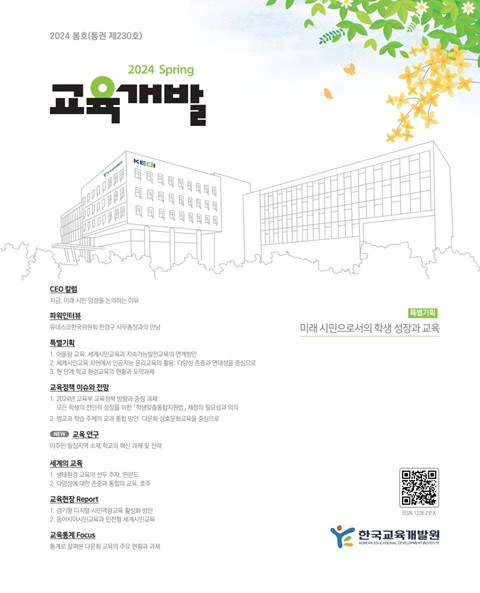 미래 시민으로서의 학생 성장과 교육 (교육개발; 2024년 봄호, Vol. 230) 발행 연도: 2024 단체 저자: 한국교육개발원 CEO 칼럼지금, 미래 시민 양성을 논의하는 이유 파워인터뷰유네스코한국위원회 한경구 사무총장과의 만남 특별기획미래 시민으로서의 학생 성장과 교육1.어울림 교육: 세계시민교육과 지속가능발전교육의 연계방안2.세계시민교육 차원에서 인공지능 윤리교육의 활용: 다양성 존중과 연대성을 중심으로3.현 단계 학교 환경교육의 현황과 도약과제 교육정책 이슈와 전망1. 2024년 교육부 교육정책 방향과 중점 과제: 모든 학생의 전인적 성장을 위한 「학생맞춤통합지원법」제정의 필요성과 의의2. 범교과 학습 주제의 교과 통합 방안: 다문화·상호문화교육을 중심으로 NEW 교육 연구이주민 밀집지역 소재 학교의 혁신 과제 및 전략 세계의 교육1.생태환경 교육의 선두 주자, 핀란드2.다양성에 대한 존중과 통합의 교육, 호주 교육현장 Report1.경기형 디지털 시민역량 교육 활성화 방안2.동아시아시민교육과 인천형 세계시민교육 교육통계 Focus통계로 살펴본 다문화 교육의 주요 현황과 과제
