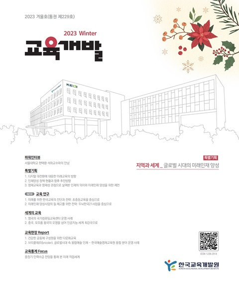 지역과 세계: 글로벌 시대의 미래인재 양성 (교육개발; 2023년 겨울호, Vol. 229) 발행 연도: 2023 단체 저자: 한국교육개발원 파워인터뷰서울대학교 현택환 석좌교수와의 만남 특별기획지역과 세계 _ 글로벌 시대의 미래인재 양성1.디지털 대전환에 대응한 미래교육의 방향2.인재양성 정책 현황과 향후 추진방향3.영재교육과 영재성 관점으로 살펴본 인재의 의미와 미래인재 양성을 위한 제언 NEW 교육 연구1. 미래를 위한 한국교육의 진단과 전략: 초중등교육을 중심으로2. 미래인재 양성사업의 질 제고를 위한 전략: 두뇌한국21사업을 중심으로 세계의 교육1. 영국의 국가컴퓨팅교육센터 운영 사례2. 중국, 모조품 왕국의 오명을 넘어 인공지능 세계 최강국으로 교육현장 Report 1. 건강한 공동체 구성원을 위한 다문화교육2. 브리콜레르(bricoler), 글로벌시대 속 융합예술 인재 - 한국예술영재교육원 융합 분야 운영 사례 교육통계 Focus중장기 인력수급 전망을 통해 본 미래 직업세계