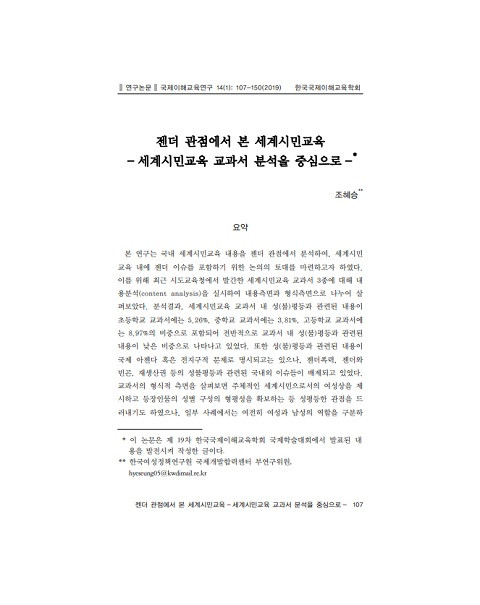 ์๋๊ณ ๋ ์์ผ๋, ์ ๋ํญ๋ ฅ, ์ ๋์ ๋น๊ณค, ์ฌ์์ฐ๊ถ ๋ฑ์ ์ฑ๋ถํ๋ฑ๊ณผ ๊ด๋ จ๋ ๊ตญ๋ด์ธ ์ด์๋ค์ด ๋ฐฐ์ ๋๊ณ ์์๋ค. ๊ต๊ณผ์์ ํ์์ ์ธก๋ฉด์ ์ดํด๋ณด๋ฉด ์ฃผ์ฒด์ ์ธ ์ธ๊ณ์๋ฏผ์ผ๋ก์์ ์ฌ์ฑ์์ ์ ์ํ๊ณ ๋ฑ์ฅ์ธ๋ฌผ์ ์ฑ๋ณ ๊ตฌ์ฑ์ ํํ์ฑ์ ํ๋ณดํ๋ ๋ฑ ์ฑํ๋ฑํ ๊ด์ ์ ๋๋ฌ๋ด๊ธฐ๋ ํ์์ผ๋, ์ผ๋ถ ์ฌ๋ก์์๋ ์ฌ์ ํ ์ฌ์ฑ๊ณผ ๋จ์ฑ์ ์ญํ ์ ๊ตฌ๋ถํ๋ฉฐ ์ฑ ๋ถ๋ฆฌ์ ํ๋์ ํตํ ์ฑ์ฐจ๋ณ์ ์ธ์์ ๋ณด์ด๊ธฐ๋ ํ์๋ค. ์ด๋ฌํ ๊ฒฐ๊ณผ๋ฅผ ํ ๋๋ก ์ธ๊ณ์๋ฏผ๊ต์ก ๋ด ์ฑํ๋ฑ ์ด์์ ์ค์์ฑ ๋ฐ ๊ตฌ์กฐ์ ์ฑ๋ถํ๋ฑ๊ณผ ์ฐจ๋ณ์ ๋ํ ๋ด์ฉ์ด ํ๋๋์ด์ผ ํจ์ ์ฃผ์ฅํ๋ฉฐ, ๊ตญ๋ด ์ธ๊ณ์๋ฏผ๊ต์ก์ ๋ด๋ก ๊ณผ ์ค์ฒ์ ์ ๋์ ๊ด์ ์์ ์ฌ๊ฒํ ํ๋ ์์