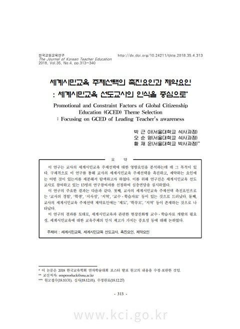 ์ ์ฐ๊ตฌ์ฐธ์ฌ์๋ฅผ ์ ์ ํ์ฌ ์ฌ์ธต๋ฉด๋ด์ ์ค์ํ์๋ค. ์ด ์ฐ๊ตฌ์ ์ฃผ์ํ ๊ฒฐ๊ณผ๋ ๋ค์๊ณผ ๊ฐ๋ค. ์ฒซ์งธ, ๊ต์ฌ์ ์ธ๊ณ์๋ฏผ๊ต์ก ์ฃผ์ ์ ํ ์ด์ง์์ธ์ผ๋ก ๋ โ๊ต์ฌ์ ๊ฒฝํโ, โํ์โ, โ์์ฌ์ฑโ, โ์ง์ญโ, โ๊ต์ใํ์ต์๋ฃโ ๋ฑ์ด ์๋ ๊ฒ์ผ๋ก ๋๋ฌ๋ฌ๋ค. ๋์งธ, ๊ต์ฌ์ ์ธ๊ณ์๋ฏผ๊ต์ก ์ฃผ์ ์ ํ ์ ์ฝ์์ธ์๋ โ์ ๋โ, โํ๋ถ๋ชจโ, โ์ง์ญโ ๋ฑ์ด ์กด์ฌํ๋ ๊ฒ์ผ๋ก ๋ ํ๋ฌ๋ค. ์ด ์ฐ๊ตฌ์ ๊ฒฐ๊ณผ๋ฅผ ํ ๋๋ก, ์ธ๊ณ์๋ฏผ๊ต์ก๊ณผ ๊ด๋ จํ ํ์ฅ์นํํ ๊ต์ใํ์ต์๋ฃ ๊ฐ๋ฐ์ ํ์์ฑ, ์ธ๊ณ์๋ฏผ๊ต์ก์ ๋ํ ๊ต์ก์ฃผ์ฒด์ ์ธ์ ์ ๊ณ ๊ฐ ๊ฐ์ง๋ ์ค์์ฑ ๋ฑ์ ๋ํด ๋