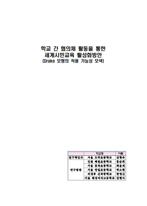 ํ๊ต ๊ฐ ํ์์ฒด ํ๋์ ํตํ ์ธ๊ณ์๋ฏผ๊ต์ก ํ์ฑํ๋ฐฉ์ (Drake ๋ชจํ์ ์ ์ฉ ๊ฐ๋ฅ์ฑ ๋ชจ์) ๋ฐํ ์ฐ๋: 2016 ์ ์: ๊นํ์ | ํ์ํฌ | ์ต์ค์ฌ | ๋ฐ์ํ | ํ์์ | ๊นํ์ ๋จ์ฒด ์ ์: ์์ธํน๋ณ์๊ต์ก์ฒญ ๊ต์ก์ฐ๊ตฌ์ ๋ณด์ ๋ณธ ์ฐ๊ตฌ๋ ํ๊ต ๊ฐ ํ์์ฒด ํ๋์ ํตํ ์ธ๊ณ์๋ฏผ๊ต์ก ํ์ฑํ ๋ฐฉ์ ์ฐ๊ตฌ๋ก ๊ต๊ณผ๊ต์ก ๋ฐ ์ฐฝ์์ ์ฒดํํ๋์ ํตํ ์ธ๊ณ์๋ฏผ๊ต์ก ์ ์ฉ๋ฐฉ์์ ๋ชจ์ํ๊ณ ์ดยท์คยท๊ณ ๋ฑํ๊ต์ ๊ต์ก๊ณผ์ ์ ๋ถ์ํ์ฌ ์ธ๊ณ์๋ฏผ๊ต์ก์ ์ ํฉํ ๊ต์ก๋ด์ฉ์ ์ ์ํ๋ค. ์์ธํน๋ณ์๊ต์ก์ฒญ๊ต์ก์ฐ๊ตฌ์ ๋ณด์์ด(๊ฐ) ์ฐฝ์ํ [์๊ต์ฐ2019-25]2019 ์ํ์ฐ๊ตฌ(ํ๊ต ํ์ฅ ์ ์ฉ์ ์ํ ํํ๊ต์ก ์ ์ฑ