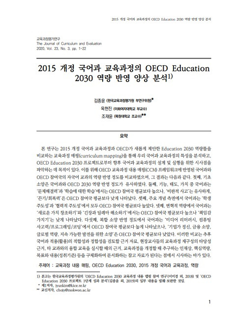 2015 ๊ฐ์ ๊ตญ์ด๊ณผ ๊ต์ก๊ณผ์ ์ OECD Education 2030 ์ญ๋ ๋ฐ์ ์์ ๋ถ์ (๊ต์ก๊ณผ์ ํ๊ฐ์ฐ๊ตฌ; Vol. 23, No. 3) ๋ฐํ ์ฐ๋: 2020 ์ ์: ๊น์ข