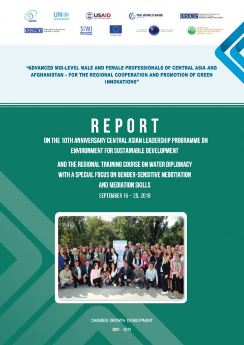 Отчет о 10-й Юбилейной Центрально-Азиатской Программе Лидерства по окружающей среде для устойчивого развития;16-22 сентября 2019 года и Региональном тренинге ОБСЕ по водной дипломатии с особым акцентом на навыки ведения переговоров и медиацию с учетом ген Год публикации: 2019 Организация-автор: Regional Environmental Centre for Central Asia (CAREC) Публикация является отчетом о 10-й юбилейной центральноазиатской программе лидерства по окружающей среде для устойчивого развития (16-22 сентября 2019 г.) и региональном тренинге ОБСЕ по водной дипломатии с особым акцентом на навыки ведения переговоров и медиацию с учетом гендерных факторов (23-25 сентября 2019 г.), подготовленной РЭЦЦА в сотрудничестве с региональными и международными партнерами.