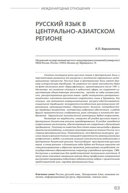 Русский язык в Центрально-Азиатском регионе Год публикации: 2014 Автор: Ksenia .P. Borishpolets Статья посвящена роли русского языка в Центральной Азии и перспективам развития его ресурсов в контексте евразийских интеграционных процессов.