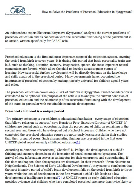 Как решить проблемы дошкольного образования в Кыргызстане? Год публикации: 2021 Автор: Ekaterina Kasymova Организация-автор: Central Asian Bureau for Analytical Reporting (CABAR) В статье независимый эксперт Екатерина Касымова анализирует текущее положение дошкольной ступени образования и его взаимосвязь с успешным функционированием государства.