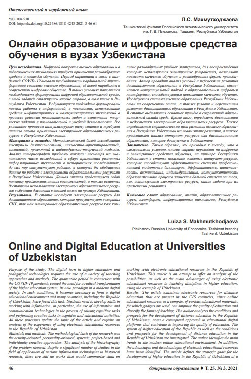 Онлайн образование и цифровые средства обучения в вузах Узбекистана (Открытое образование; vol. 25, no.3) Год публикации: 2021 Автор: Makhmutkhodjaeva L.S. Период карантина в связи с пандемией COVID-19 вызвали необходимость кардинальной трансформации системы высшего образования, её новой парадигмы в современном цифровом обществе. В таких условиях появляется необходимость формирования цифровой образовательной среды, с этой задачей столкнулись многие страны, в том числе и Республика Узбекистан. У обучающихся необходимо формировать навыки работы с информацией, в частности, использование средств информационных и коммуникационных технологий в процессе решения познавательных задач и выполнения творческих заданий в познавательной и учебной деятельности.