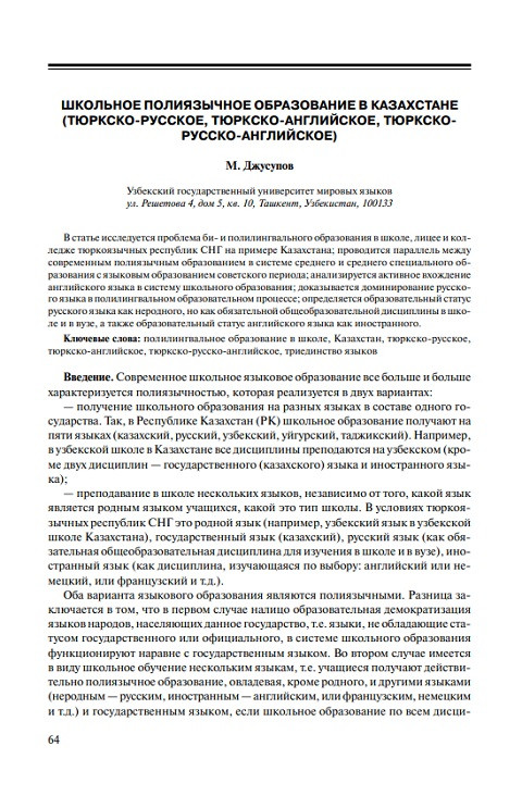 Школьное полиязычное образование в Казахстане (тюркско-русское, тюркско-английское, тюркско-русско-английское) Год публикации: 2015 Автор: Dzhusupov M. В статье исследуется проблема би- и полилингвального образования в школе, лицее и колледже тюркоязычных республик СНГ на примере Казахстана; проводится параллель между современным полиязычным образованием в системе среднего и среднего специального образования с языковым образованием советского периода; анализируется активное вхождение английского языка в систему школьного образования; доказывается доминирование русского языка в полилингвальном образовательном процессе; определяется образовательный статус русского языка как неродного, но как обязательной общеобразовательной дисциплины в школе и в вузе, а также образовательный статус английского языка как иностранного.